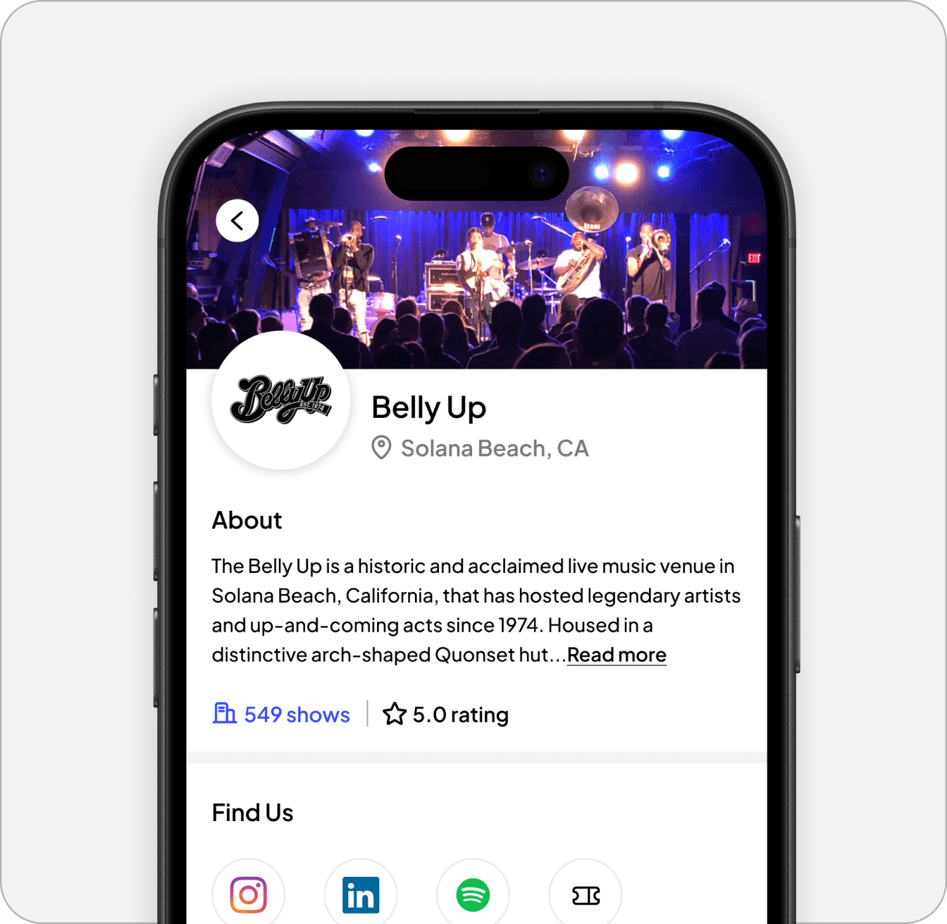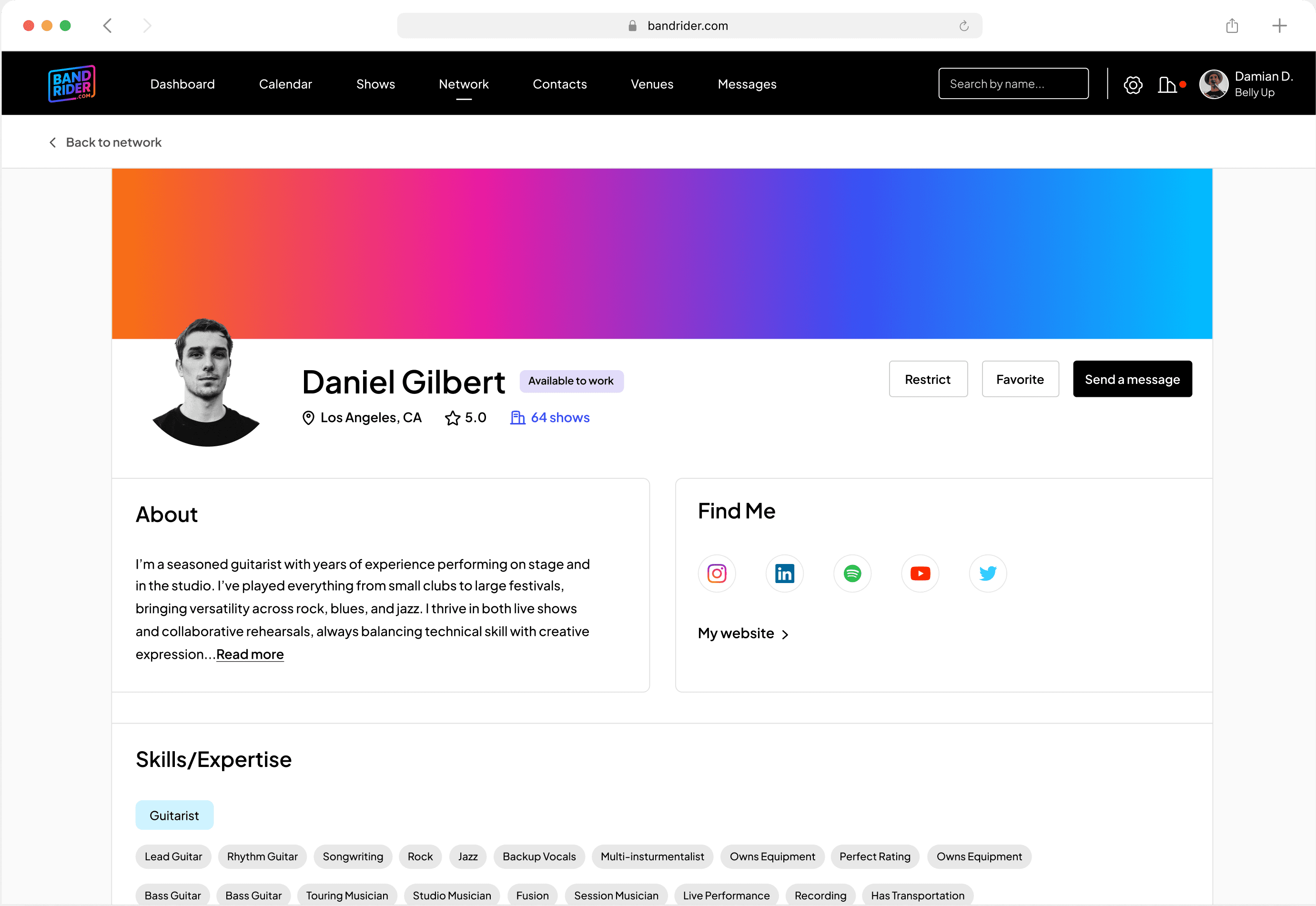 Musician Profile - Skills, availability status, social links, and show history. Discoverable and always current.