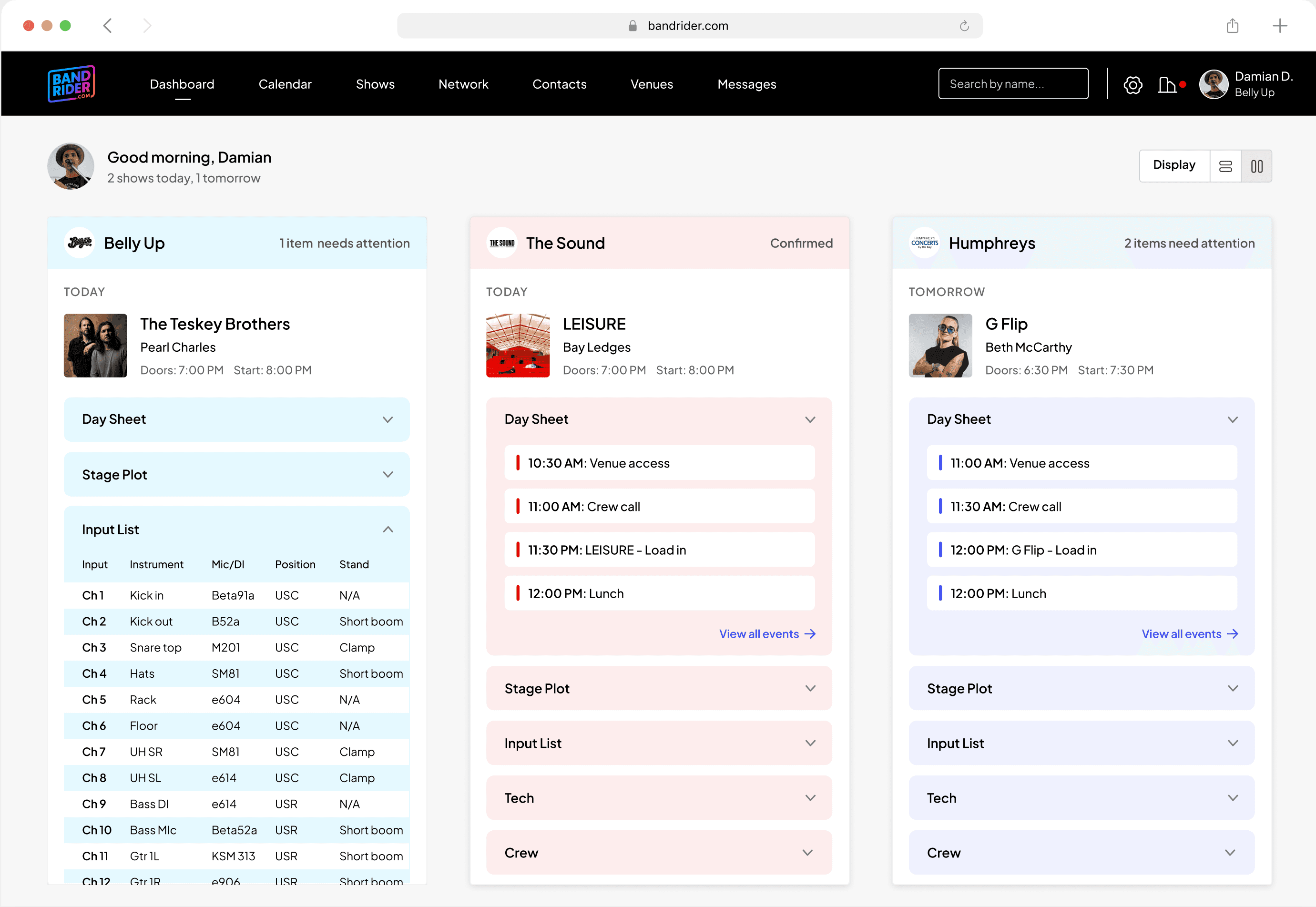 I designed the dashboard as an operational radar. When a PM logs in, they see their active venues in columns—Belly Up, The Sound, Humphreys—each showing today's shows and tomorrow's schedule. Day sheets expand inline with time-stamped events: venue access, crew call, load-in, lunch. Below that, quick access to stage plots, input lists, tech specs, and crew contacts.