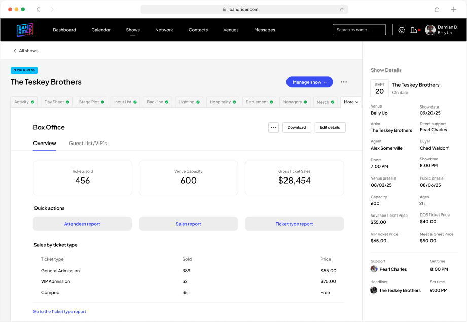 Crucially, business data lives here too. The Box Office tab shows tickets sold (456 of 600 capacity), revenue ($28,454), breakdowns by ticket type, and pricing tiers. Settlement and financial performance sit alongside logistics, reflecting how venues actually measure success.