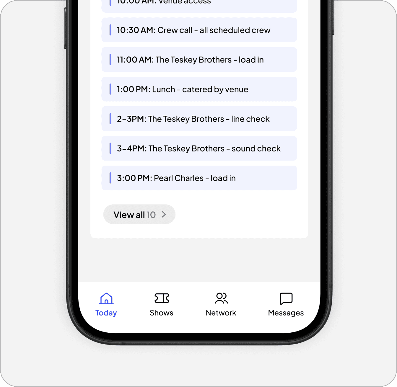 On show day, no one sits at a desk. Stage managers are on the floor. Tour managers are moving between green room and front of house. Crew leads are checking in vendors and coordinating load-in. They need information fast, in context, on their phones. I scoped the mobile experience intentionally for read-and-react moments. The Today view shows upcoming events with times and key details. The Shows list gives quick access to any active show. Drilling into a show surfaces Day Sheet, Stage Plot, Input List, and Tech specs—the information crews actually need in the moment.
