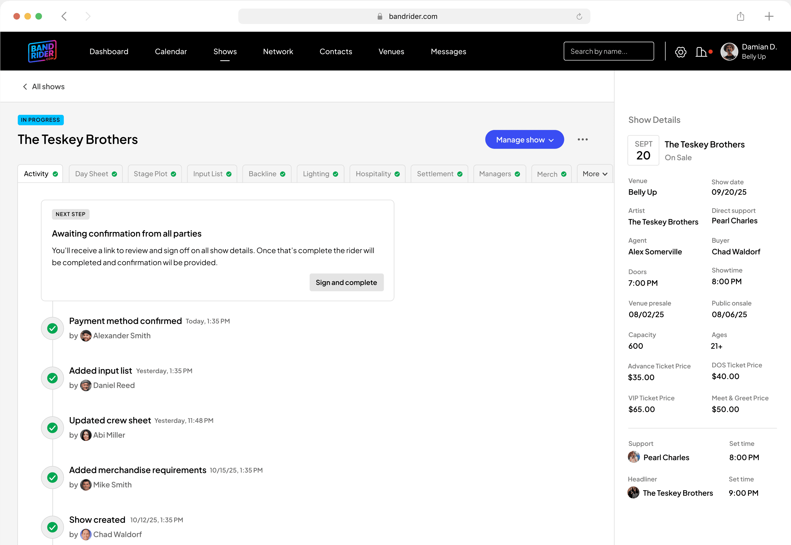 Once a show is created, it becomes a workspace—not just a record. Instead of scattered documents and disconnected conversations, all operational areas live in one place. The show view has tabs for Activity, Day Sheet, Stage Plot, Input List, Backline, Lighting, Hospitality, Settlement, Merch, and more. Each section is editable, trackable, and tied to the show's timeline.
