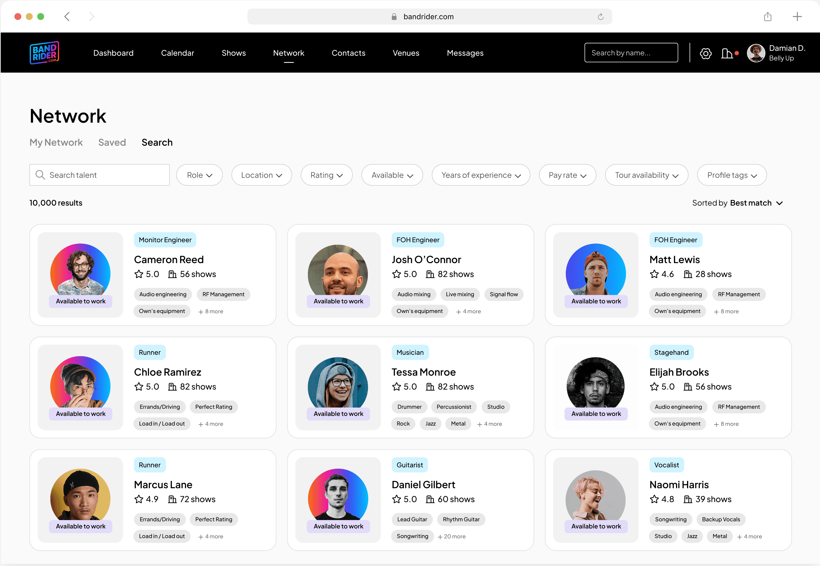 The Search view opens this up further, showing the broader BandRider network with filters for role, location, experience, and pay range. This transforms BandRider from a show management tool into an industry-wide professional network.
