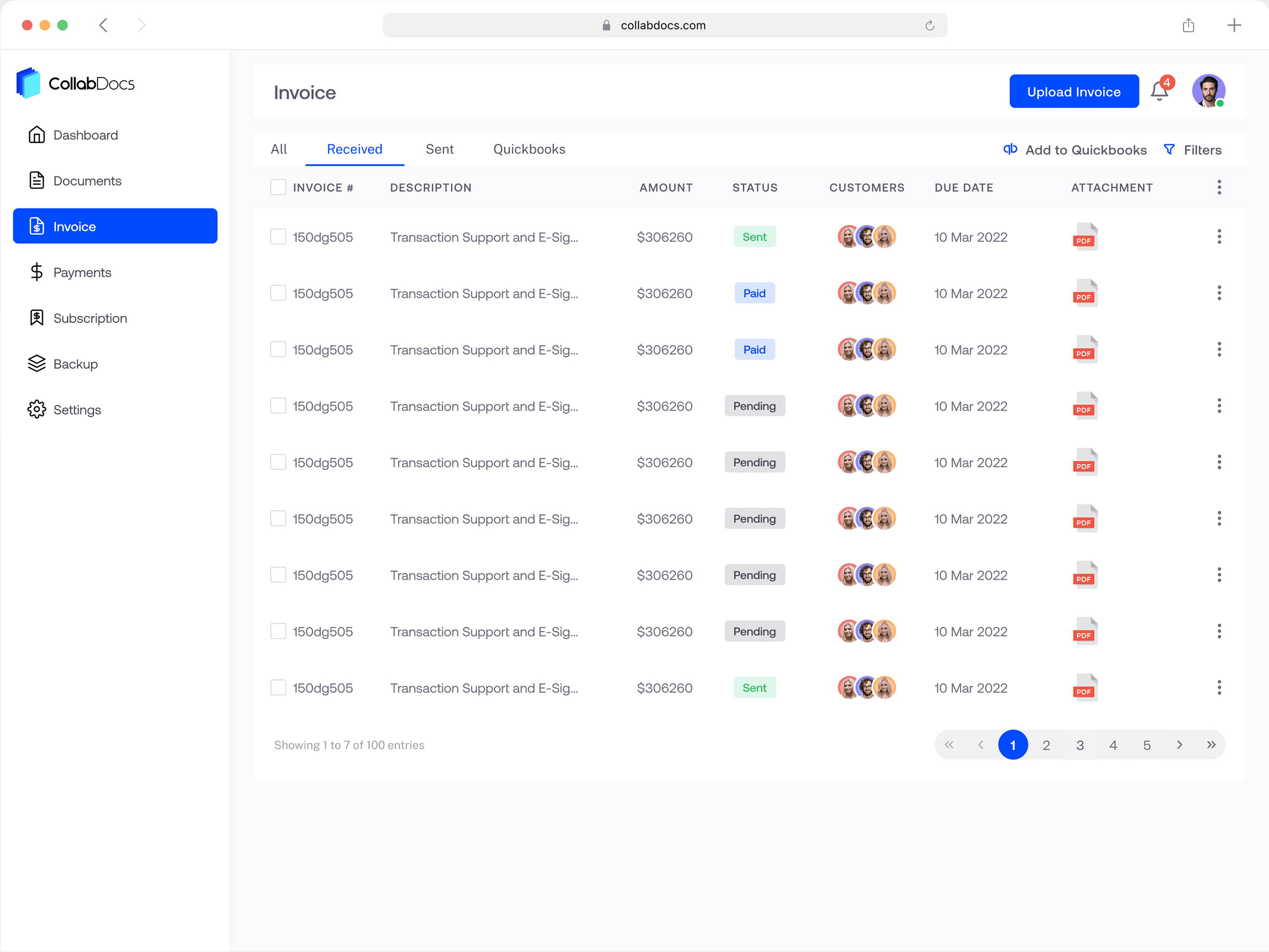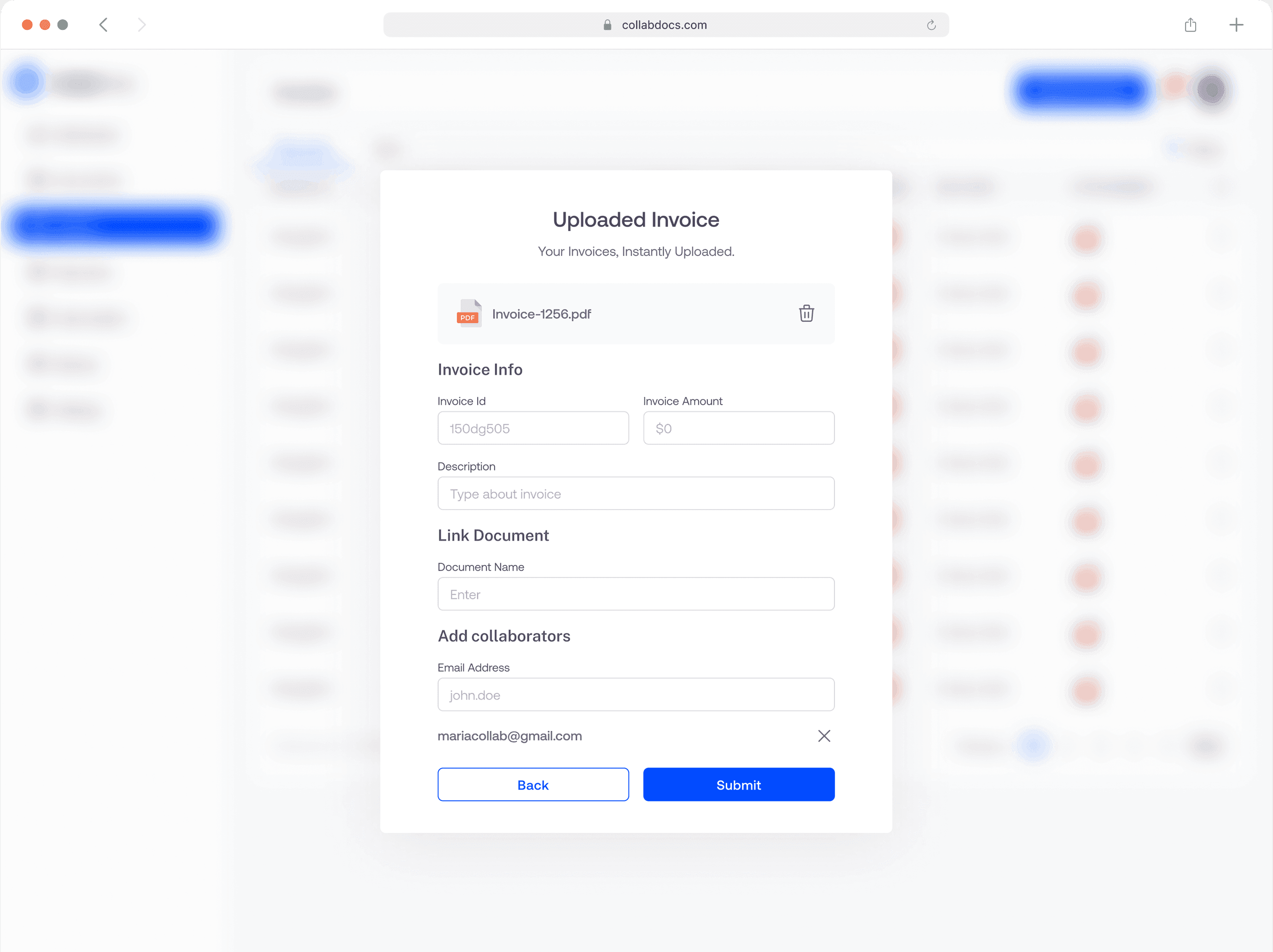 The upload modal asks for invoice ID, amount, linked document, and collaborators—just enough structure to keep things traceable without creating friction.
