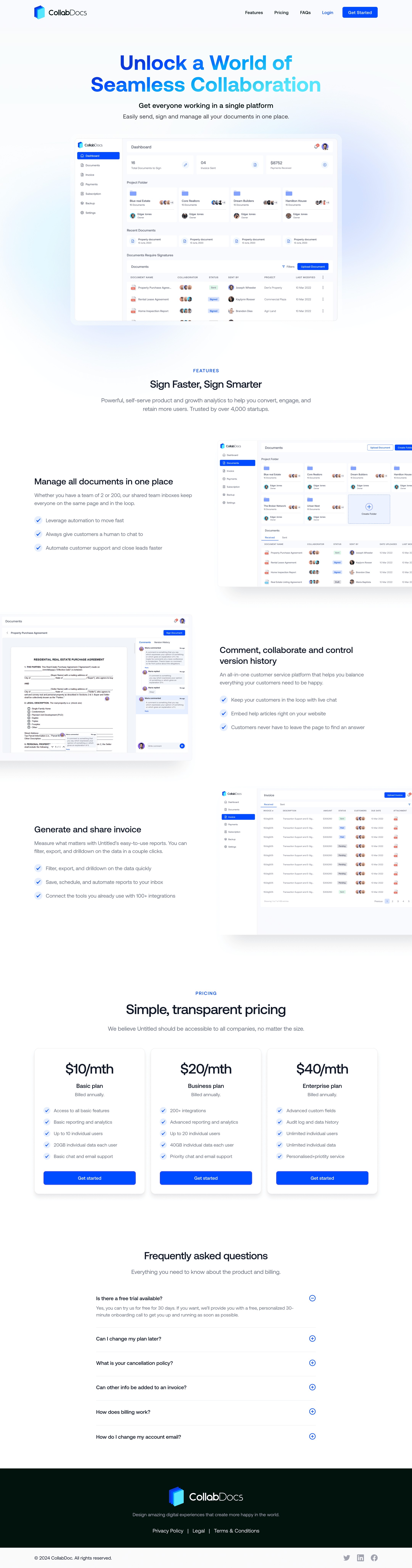 CollabDocs was designed to close that gap: a shared workspace where multi-party teams can manage documents, signatures, and invoices in one place—without the friction that usually comes from stitching separate systems together.