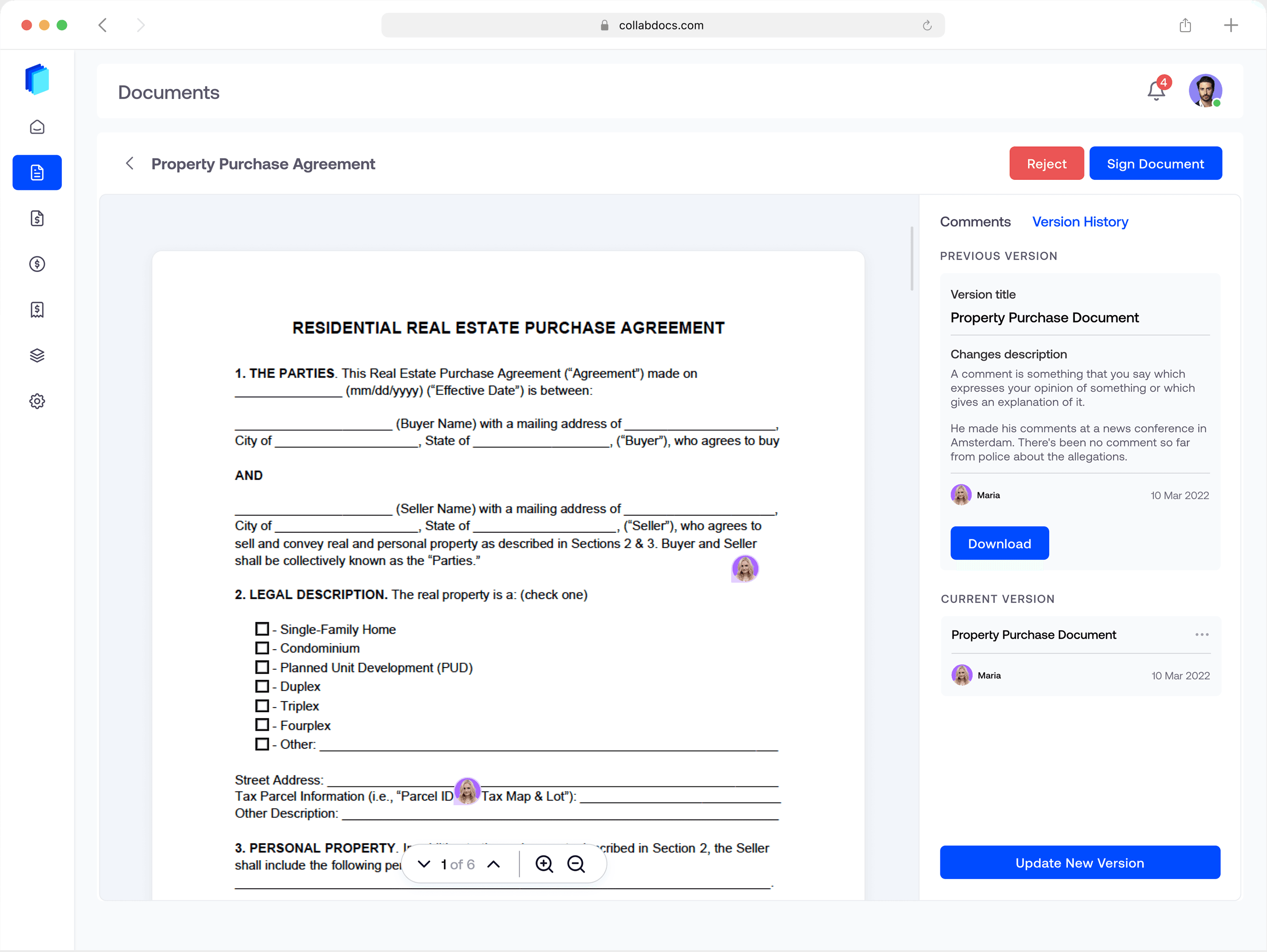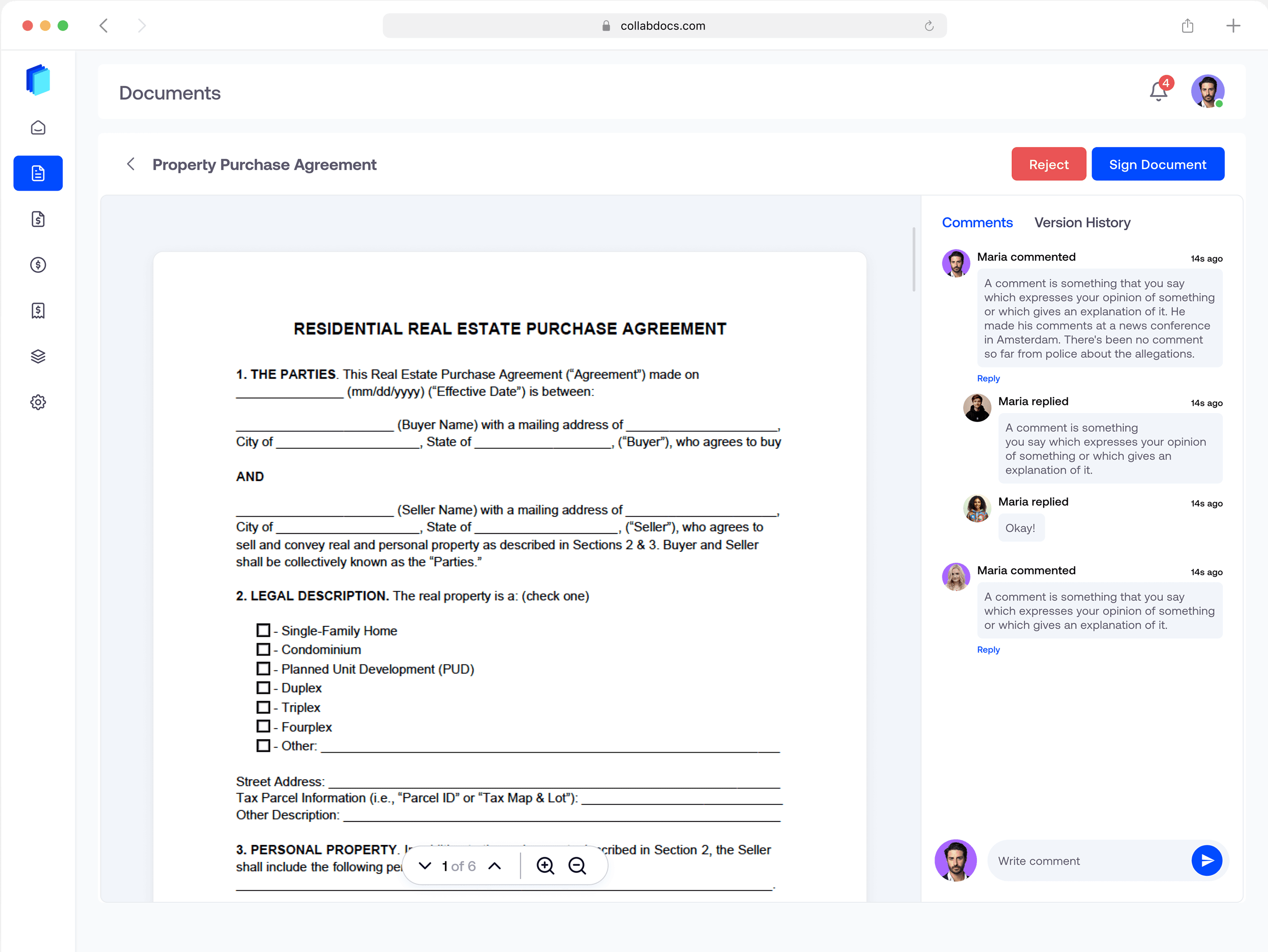 The document viewer keeps the file front and center with comments and version history in a right-hand panel. Reviewers can read, annotate, and discuss without leaving the context. The conversation stays attached to the thing it's about.