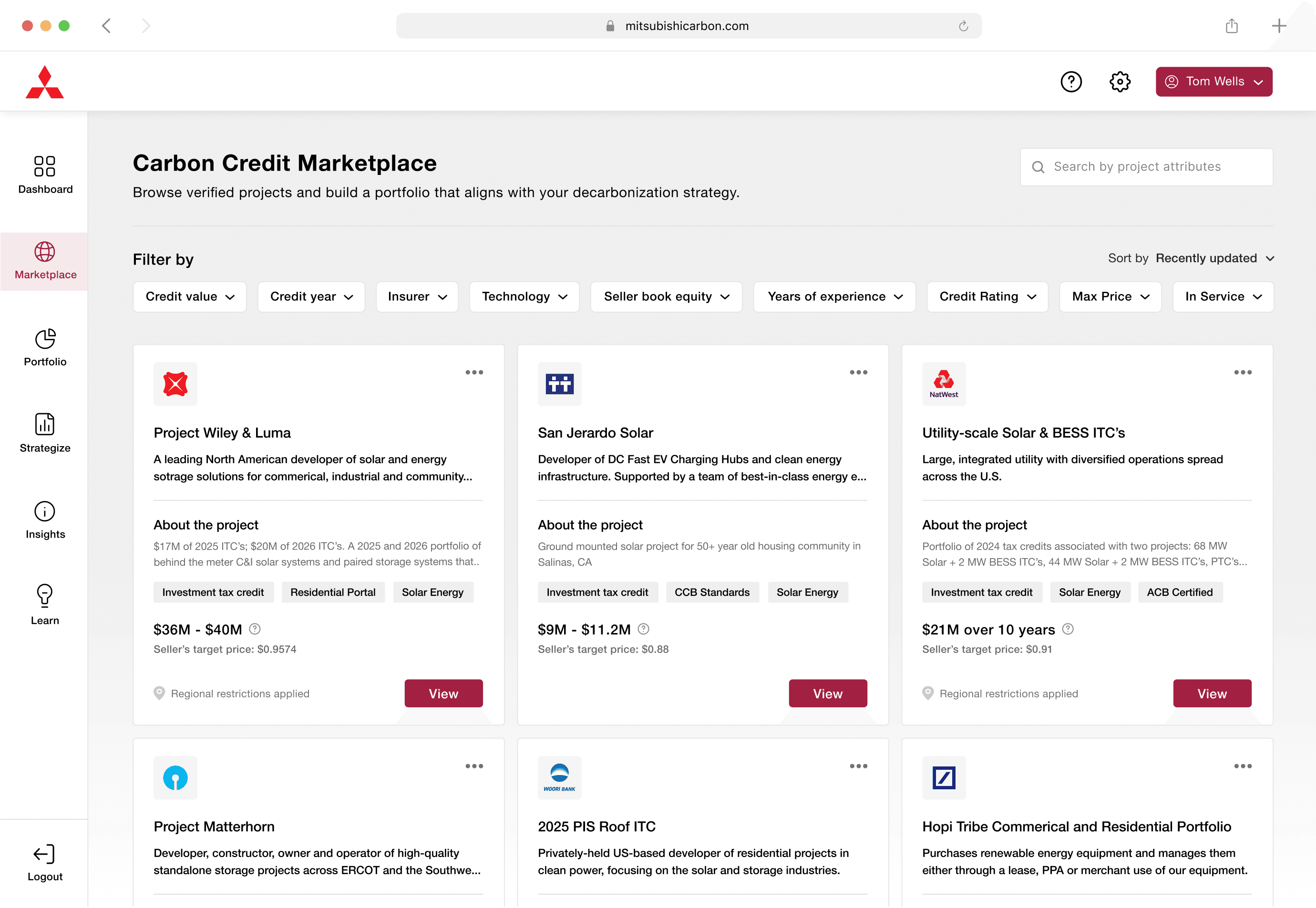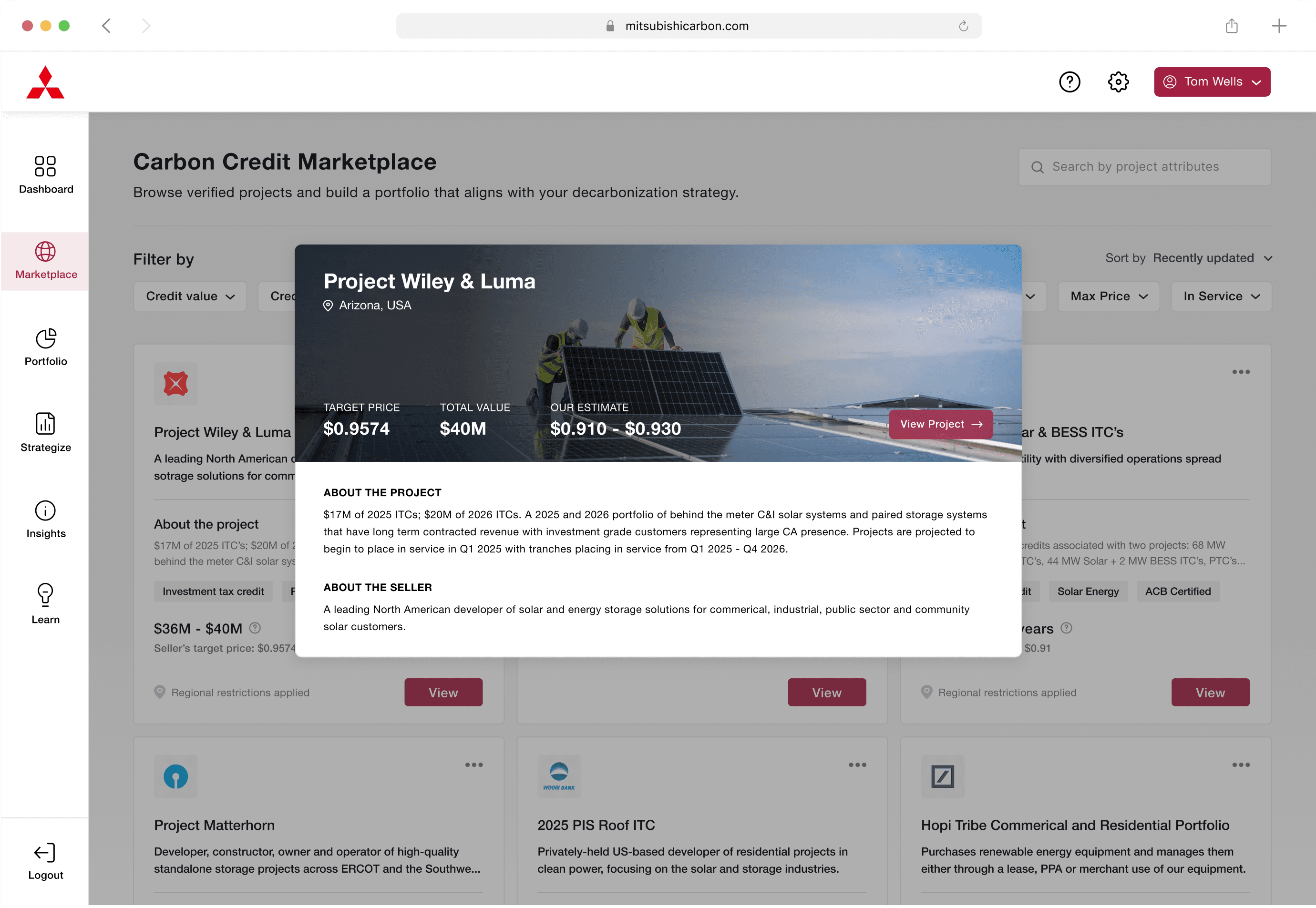 The entry point. Project types, credit values, and geographies at a glance. Designed to give executives the shape of the market before they evaluate anything specific. Familiar card pattern — scannable without instruction.