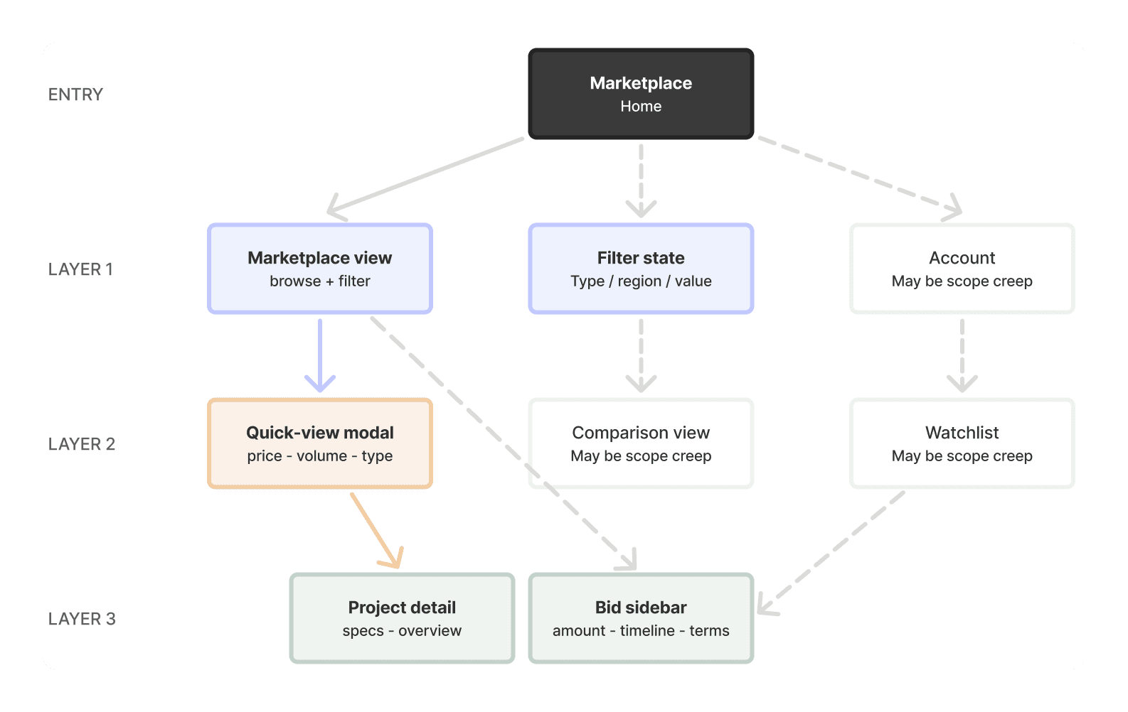 I made decent calls on the information hierarchy — marketplace to modal to detail — but I got there through instinct rather than anything mapped out deliberately. Writing that structure down before designing the screens would have made the whole thing easier to explain and defend.